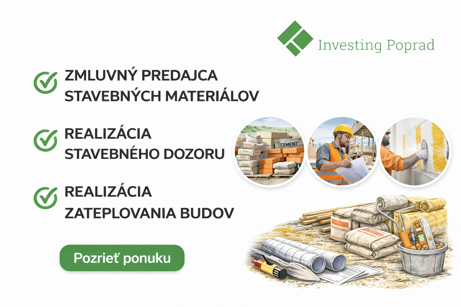 Firma Investing Poprad je rodinná spoločnosť, ktorá sa už viac ako 20 rokov špecializuje na predaj stavebných materiálov pre stavby a rekonštrukcie.